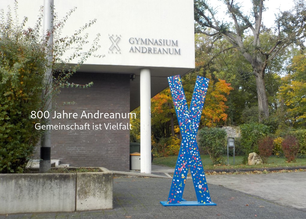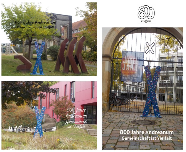 Zum Abschied vom Jubiläumsjahr gab es für alle anwesenden Mitfeiernden noch Postkarten, auf denen das blaue Andreaskreuz an exponierten Stellen des Schulgeländes aufgebaut zum Blickfang geworden war und die 800 vergangenen Jahre beleuchtete. Dort hindurch ging aber der Blick auf die zukünftige Zeit, die ohne Jubiläumsveranstaltungen sicher weiterhin immer wieder leuchtende Momente der Schulgemeinschaft in vielfältiger Form zu bescheren weiß. Und das nächste Jubiläum kommt bestimmt – wir vertrauen darauf!